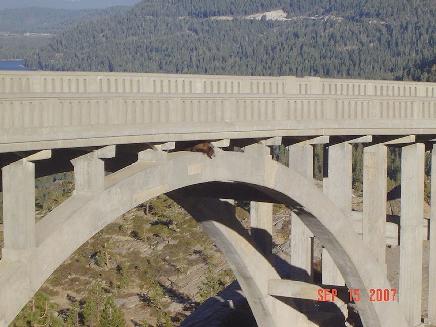 It's possible that the bear made the wrong move and ended up hanging on his claws.Somehow he managed to climb up to the arch of the bridge, where he realized that he was in a very, very bad and impossible situation. What did he do? He took a nap!