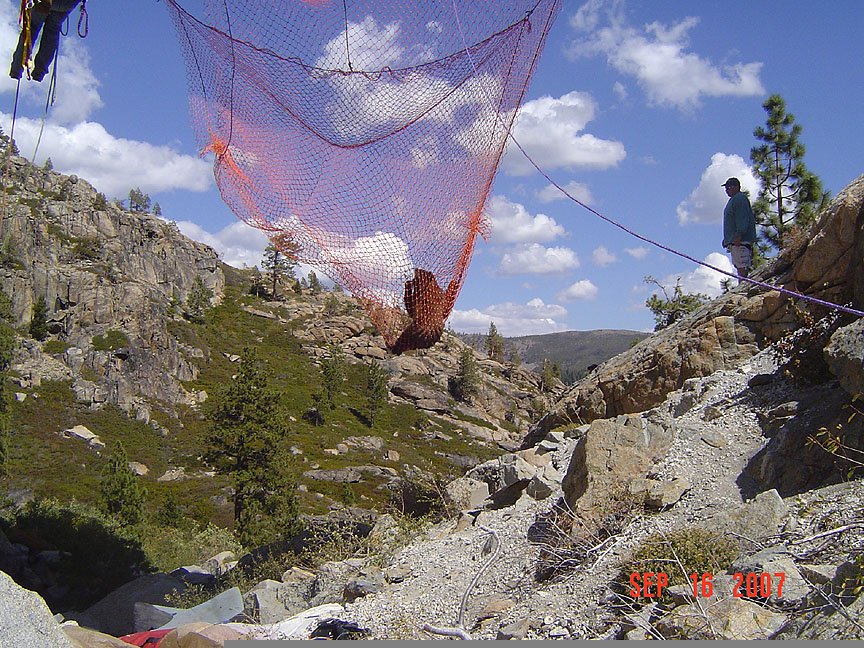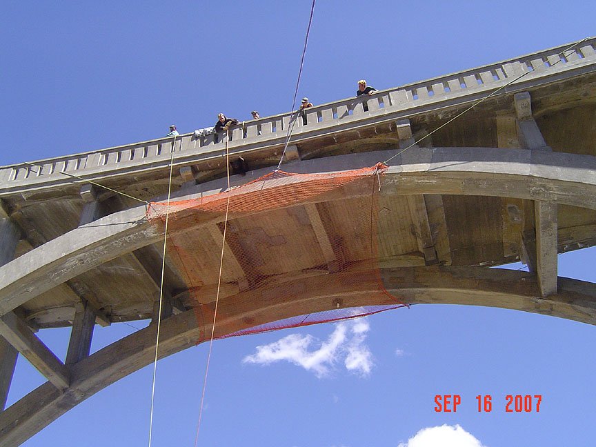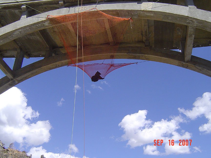 After securing a net under the bridge, they gave him a traquilizer. The bear fell on the net, they took him down, he woke up and to started to walk.